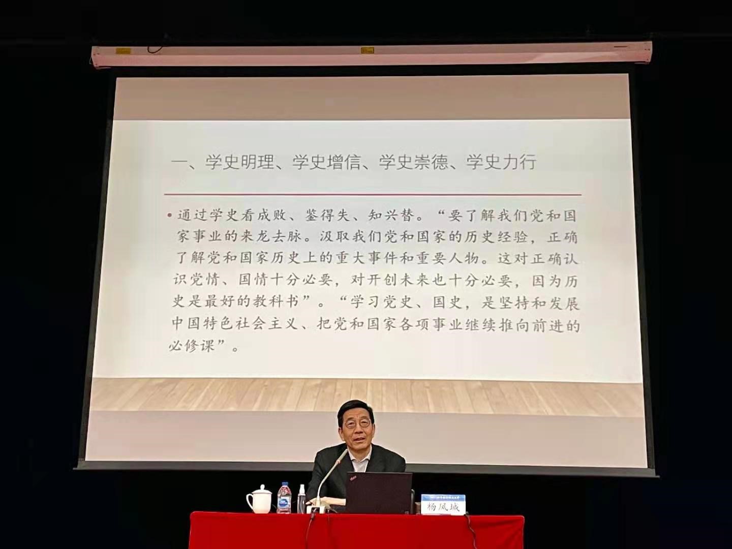 杨凤城教授围绕“为何学”“如何学”“学什么”逻辑线索展开讲授。他运用丰富史料深刻阐释党史学习的意义和价值在于“学史明理、学史增信、学史崇德、学史力行”。他还系统论述了如何进行党史学习以及学习什么,杨凤城教授强调中国共产党的一百年,是矢志践行初心使命的一百年,是筚路蓝缕奠基立业的一百年,是创造辉煌开辟未来的一百年。作为青年学生进行党史学习,最重要的是把握党史主题主线、主流本质。“国家富强、人民幸福是党的历史的鲜明主题主线;围绕国家富强、人民幸福的目标,党进行的不懈奋斗史、理论探索史、自身建设史,构成党史的本质与主流。”